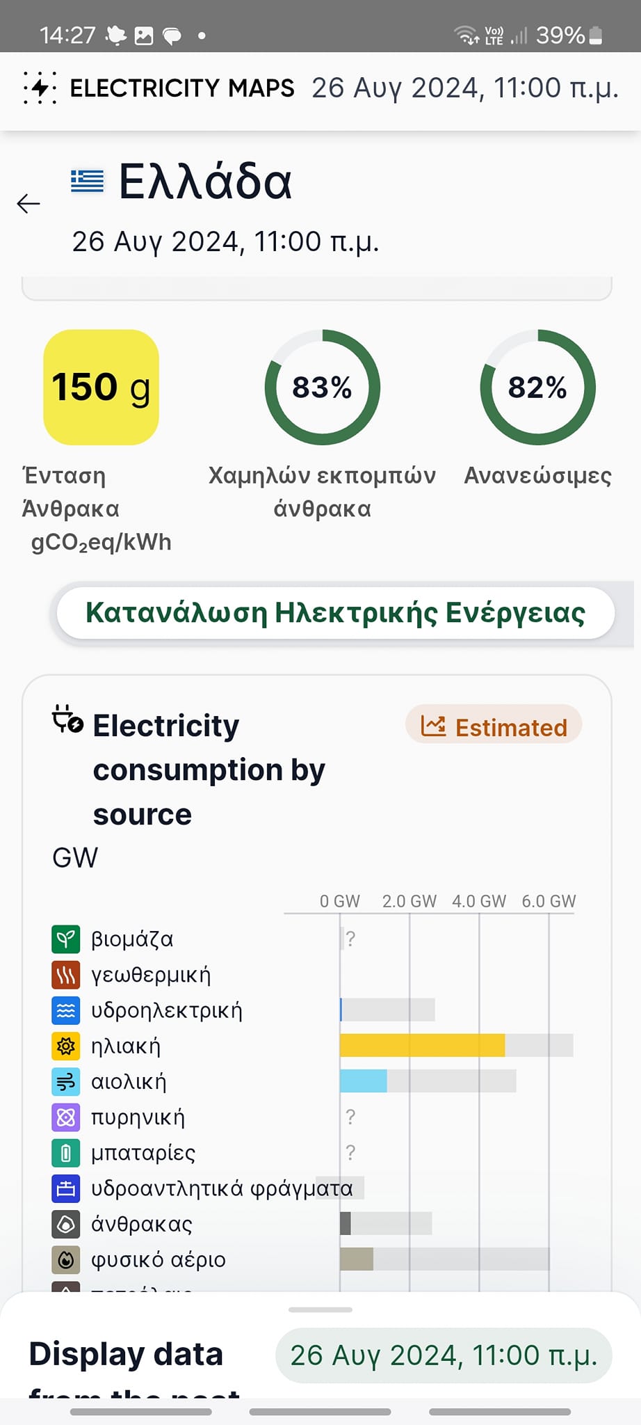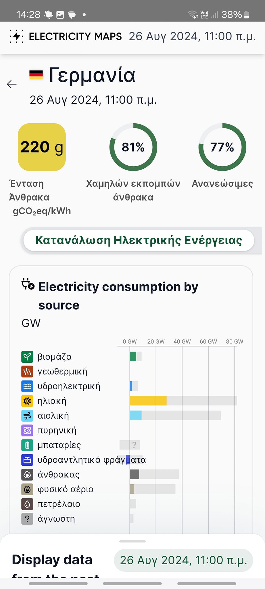 Σήμερα στις 14 00 μ.μ οι Γερμανοί είχαν στο μείγμα τους 77% ΑΠΕ. Στην Ελλάδα προηγηθήκαμε πανευρωπαικά με 82% ΑΠΕ, λόγω υψηλών ανέμων κ ηλιοφάνειας. Όπως φαίνεται στους δύο πίνακες δεξιά στα κυκλάκια.