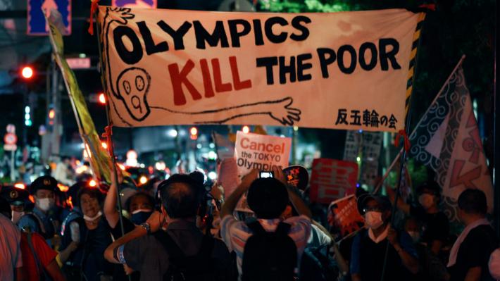 Εκατοντάδες διαδηλωτές που έφεραν πλακάτ που έγραφαν «οι ζωές πάνω από τους Ολυμπιακούς Αγώνες» διαδήλωσαν γύρω από το στάδιο. Οι διαδηλωτές, φορώντας λευκές χειρουργικές μάσκες, φώναξαν «Σταματήστε τους Ολυμπιακούς Αγώνες», ενώ το σύνθημα: «Οι Ολυμπιακοί σκοτώνουν τους φτωχούς» που είχε γραφτεί σε ένα από τα πανό αποτύπωνε με λιτό, αλλά εύστοχο τρόπο το πως σκέφτονται αρκετοί Ιάπωνες για τους Αγώνες που έχουν μετατραπεί εδώ και πολλά χρόνια σε ένα πανάκριβο εμπόρευμα.