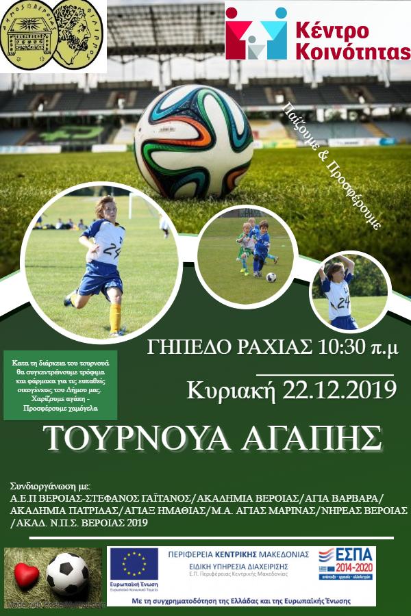 Το Κέντρο Κοινότητας Δήμου Βέροιας, διοργανώνει «Τουρνουά Αγάπης», στις 22 Δεκεμβρίου 2019 και ώρα 10:30, στο Γήπεδο της Ραχιάς.