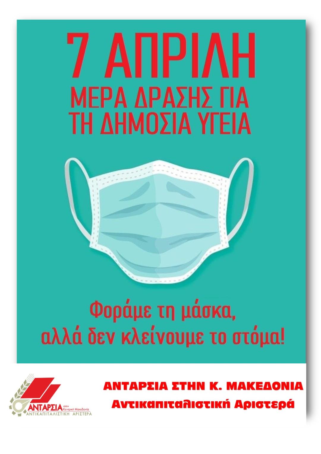 Την Τρίτη 7 Απριλίου, η Ανταρσία στην Κ. Μακεδονία – Αντικαπιταλιστική Αριστερά ενώνει την φωνή της με τις φωνές των υγειονομικών που αγωνίζονται για καθολική, δημόσια δωρεάν και ποιοτική υγεία. Με αφορμή την αυριανή παγκόσμια ημέρα υγείας και πανελλαδική μέρα δράσης για την υγεία πρέπει όλος ο λαός να δείξει τη στήριξη του στον αγώνα των εργαζομένων στα νοσοκομεία για δημόσια δωρεάν ποιοτική Υγεία.