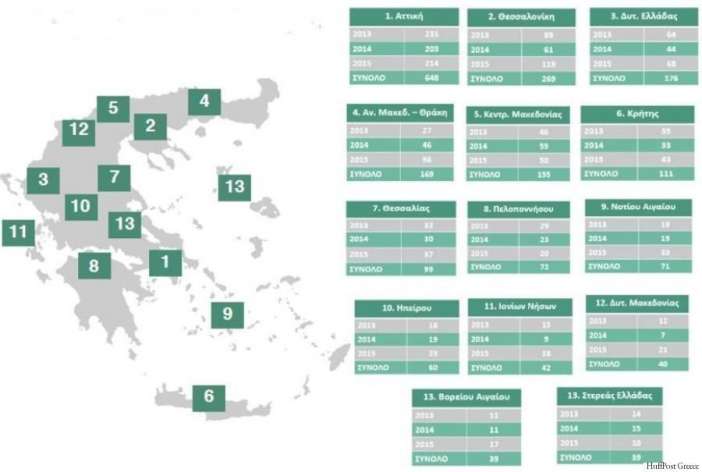 Οι περισσότερες από αυτές λαμβάνουν χώρα στην Αττική. Ακολουθεί η Θεσσαλονίκη, η περιφέρεια Δυτικής Ελλάδας, η περιφέρεια Ανατολικής Μακεδονίας και Θράκης, η περιφέρεια Κεντρικής Μακεδονίας, η Κρήτη, η Θεσσαλία και η Πελοπόννησος.