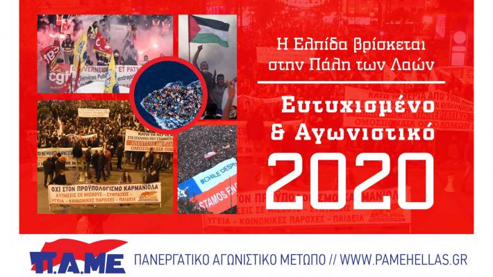 Η χρονιά που φεύγει, κλείνει την επέτειο των 20 χρόνων από την ίδρυση του ΠΑΜΕ. 20 χρόνων αγώνων, απεργιών και κινητοποιήσεων που έχουν αφήσει τεράστια παρακαταθήκη στο εργατικό κίνημα της χώρας μας, αλλά και διεθνώς. Η νέα δεκαετία μας βρίσκει πιο έμπειρους, πιο ώριμους, αλλά και με αυξημένα καθήκοντα και απαιτήσεις για να προχωρήσουμε την υπόθεση της ανασύνταξης του εργατικού κινήματος. Για την ενδυνάμωση των εργατικών αγώνων, για τη Νίκη!