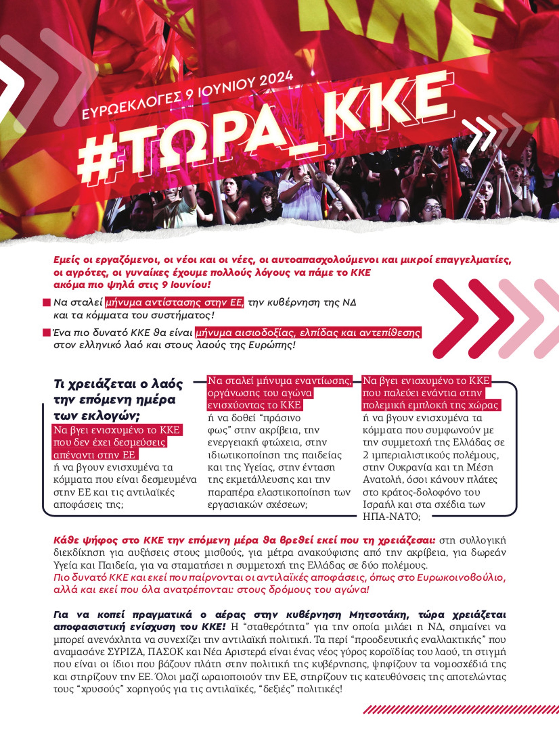 Ολοι όσοι σφίξαμε τα δόντια και βγήκαμε στους δρόμους για το προδιαγεγραμμένο έγκλημα των Τεμπών εκείνες τις μέρες αλλά και έναν χρόνο μετά, ενάντια στη συγκάλυψη, όλοι όσοι χαμογελάσαμε με τις νίκες που είχαν οι εργάτες σε διάφορους χώρους δουλειάς χάρη στον αγώνα τους, όλοι όσοι αψηφήσαμε την προπαγάνδα και εκφράζουμε την αλληλεγγύη μας στον ηρωικό λαό της Παλαιστίνης, όλοι όσοι δεν αντέχουμε να βλέπουμε οικογένειες να ξεσπιτώνονται από τα «κοράκια» των funds και κερδίζουμε ένα χαμόγελο κάθε φορά που σώζεται ένα λαϊκό σπίτι από την αλληλεγγύη και τη λαϊκή κινητοποίηση, ξέρουμε την αποφασιστική συμβολή του ΚΚΕ. Ολοι όσοι πήραμε δύναμη από τους αγώνες των φοιτητών και την πρωτιά της «Πανσπουδαστικής» στα πανεπιστήμια για 3η χρονιά...Στις 9 Ιούνη δίνουμε δύναμη στη δύναμη του λαού, ενισχύουμε αποφασιστικά το ΚΚΕ!