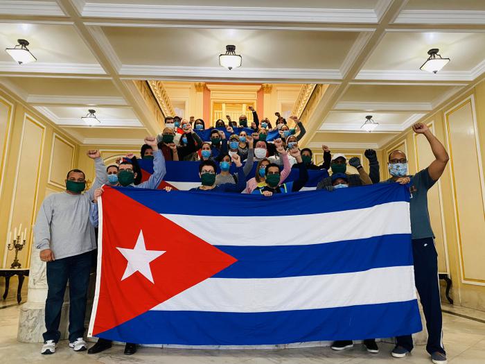 Κουβανοί διπλωμάτες από την κουβανική πρεσβεία στην Ουάσινγκτον γιόρτασαν την Πρωτομαγιά. Όλοι μαζί, με το αριστερό χέρι σηκωμένο, κρατώντας την κουβανική σημαία. Λήφθηκε στην αίθουσα του κτηρίου που μια ημέρα πριν ήταν ο στόχος τρομοκρατικής επίθεσης.