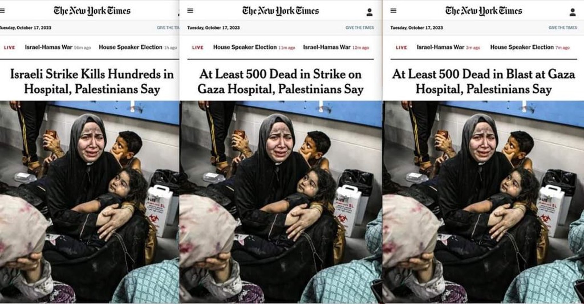 Πώς αντιστράφηκε η πραγματικότητα για το χτύπημα του νοσοκομείου στη Γάζα: Οι «New York Times» ξεκινούν με την είδηση για «ισραηλινό χτύπημα με εκατοντάδες νεκρούς». Στη συνέχεια η είδηση γίνεται: «Τουλάχιστον 500 νεκροί από χτύπημα σε νοσοκομείο, σύμφωνα με τους Παλαιστίνιους». Και μετά από νέα αλλαγή καταλήγει ως εξής: «Τουλάχιστον 500 νεκροί από έκρηξη (!) σε νοσοκομείο, σύμφωνα με τους Παλαιστίνιους»