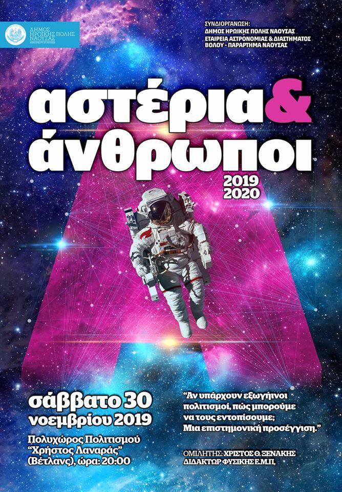 Συνεχίζεται για 20η χρονιά η σειρά των ομιλιών «Αστέρια και Άνθρωποι στη Νέα Χιλιετία», που διοργανώνει το Παράρτημα Νάουσας της Εταιρείας Αστρονομίας και Διαστήματος Βόλου.
