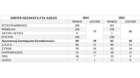 Αναλυτικά, στο 21ο Συνέδριο της ΟΛΜΕ ψήφισαν 296 αντιπρόσωποι καιη ΑΣΕ έλαβε 67 ψήφους και 3 έδρες. Οι υπόλοιπες παρατάξεις έλαβαν: ΔΑΚΕ 80 ψήφους και 3 έδρες, ΣΥΝΕΚ 60 ψήφους και 2 έδρες, «Παρεμβάσεις» 56 ψήφους και 2 έδρες, ΠΕΚ 26 ψήφους και 1 έδρα, διάφορα άλλα ψηφοδέλτια 7 ψήφους.