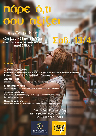Το Κέντρο Δια Βίου Μάθησης Easy Education και η Δημόσια Κεντρική Βιβλιοθήκη της Βέροιας, σας προσκαλούν στην ημερίδα με θέμα: «Δια βίου Μάθηση Εξέλιξη & σύγχρονο κοινωνικό-οικονομικό περιβάλλον». Η εκδήλωση θα πραγματοποιηθεί στη Βέροια (Δ.Κ. Βιβλιοθήκη Βέροιας οδός Έλλης 8), το Σάββατο 13 Απριλίου 2019 και ώρες 10π.μ. - 2μ.μ.