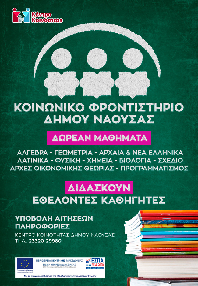 Ο Δήμος Νάουσας, θα λειτουργήσει το Κοινωνικό Φροντιστήριο για τους μαθητές Λυκείου και Γυμνασίου το σχολικό έτος 2018 – 2019.