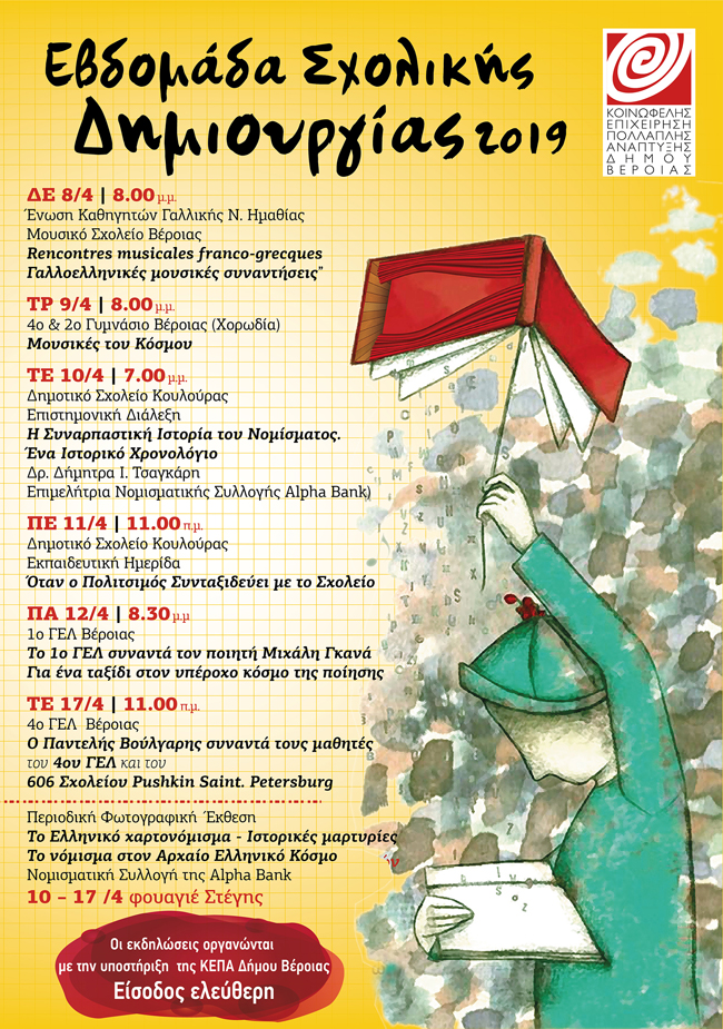 Η Κ.Ε.Π.Α. Δήμου Βέροιας υποστηρίζει δράσεις των Σχολείων του Δήμου μας. Από 10 έως και 17 Απρίλη, μουσικές συναντήσεις , ποιητικά ταξίδια , επιστημονική διάλεξη - εκπαιδευτική ημερίδα και περιοδική φωτογραφική έκθεση της Νομισματικής Συλλογής της Alpha Bank , διακρατική συνάντηση μαθητών Ελλάδας - Ρωσσίας και εκδήλωση με αφορμή την Παγκόσμια Ημέρα Γαλλοφωνίας, θα φιλοξενηθούν στην Αντωνιαδειο Στέγη Γραμμάτων και Τεχνών , στο πλαίσιο της 5ης Εβδομάδας Σχολικής Δημιουργίας . Ο ποιητής Μιχάλης Γκανάς , ο σκηνοθέτης Παντελής Βούλγαρης , η επιμελήτρια της Νομισματικής Συλλογής της Alpha Bank Δρ. Δήμητρα Τσαγκάρη θα «συνομιλήσουν» και θα «συνωμοτήσουν» με τους μαθητές επί σκηνής. Η είσοδος θα είναι ελεύθερη .