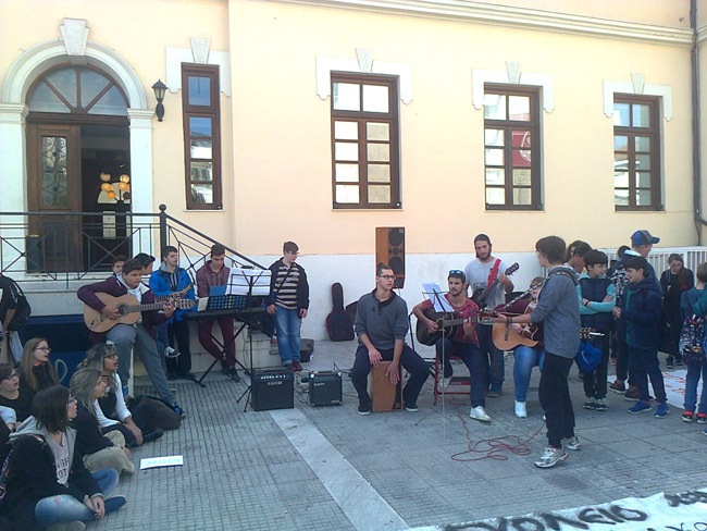 Οι μαθητές αρχικά συγκεντρώθηκαν στην πλατεία Δημαρχείου, όπου πραγματοποιήθηκε συναυλία των μαθητών του Μουσικού Σχολείου, ενώ αντιπροσωπεία τους έδωσε το ψήφισμα με τα αιτήματα τους στη δημοτική αρχή. Τη συμπαράσταση τους εξέφρασαν η ΕΛΜΕ Ημαθίας και η Ομοσπονδία Ενώσεων Γονέων και Κηδεμόνων Ν.Ημαθίας.