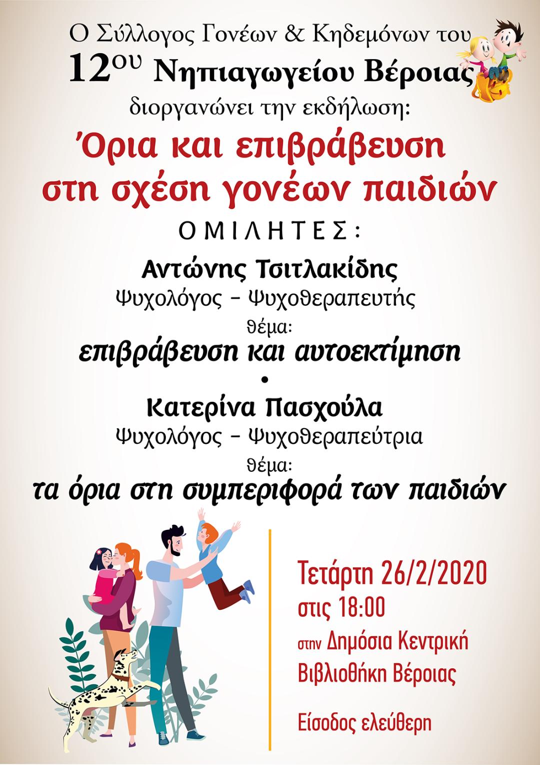 Ο Σύλλογος Γονέων και Κηδεμόνων του 12ου Νηπιαγωγείου Βέροιας διοργανώνει ενημερωτική εκδήλωση με ομιλητές τον κ. Αντώνη Τσιτλακίδη, Ψυχολόγο - Ψυχοθεραπευτή, ο οποίος θα αναπτύξει το θέμα "επιβράβευση και αυτοεκτίμηση" και την κ. Κατερίνα Πασχούλα, Ψυχολόγο - Ψυχοθεραπεύτρια, η οποία θα αναπτύξει το θέμα " τα όρια στην συμπεριφορά των παιδιών".