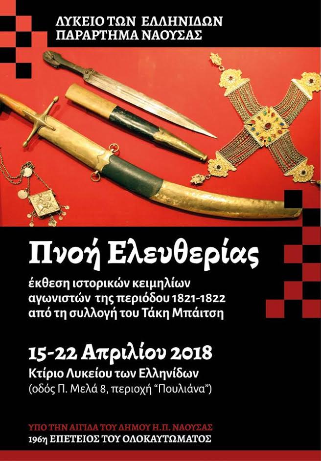 Το Λύκειο των Ελληνίδων Νάουσας ανοίγει την έκθεση ιστορικών κειμηλίων της περιόδου 1821-1822 με θέμα « πνοή ελευθερίας» την Κυριακή του Θωμά 15 Απριλίου 2018 στο κτίριο του Π. Μελά 8