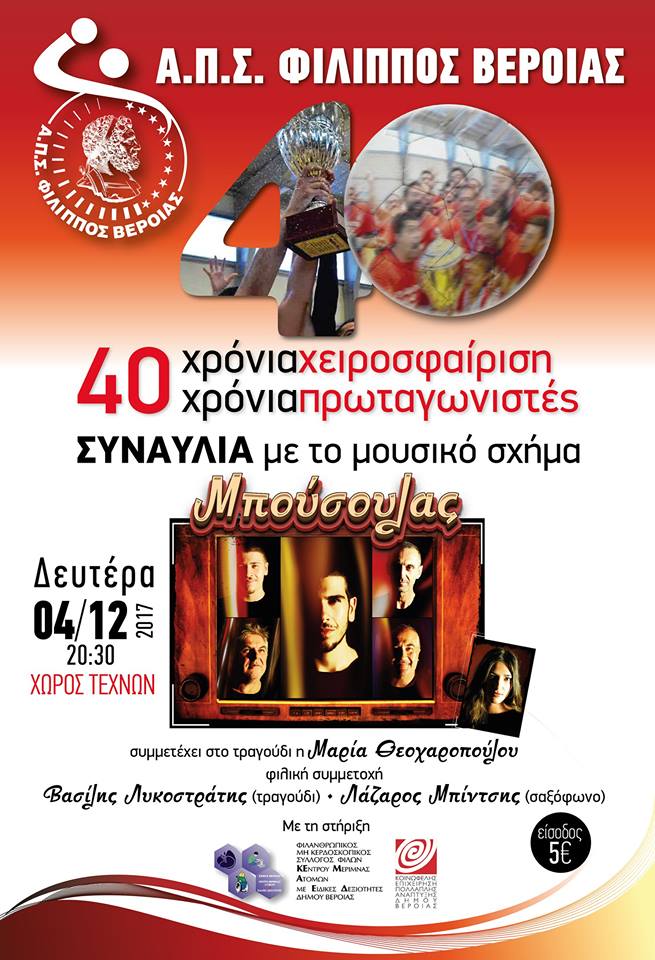 Με αφορμή τα 40 χρόνια χειροσφαίρισης στην Ελλάδα, ο ΦΙΛΙΠΠΟΣ ΒΕΡΟΙΑΣ διοργανώνει μια ξεχωριστή συναυλία με το Βεροιώτικο μουσικό σχήμα “Μπούσουλας” στην αίθουσα του Χώρου Τεχνών την Δευτέρα 4 Δεκεμβρίου και ώρα 20:30.