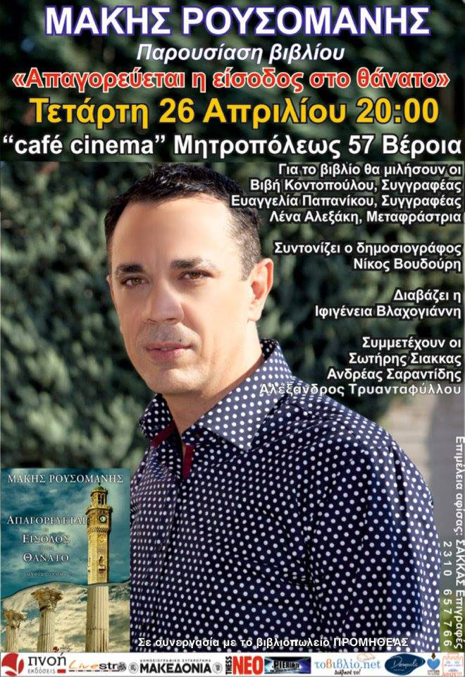 Οι Εκδόσεις "Πνοή" σε συνεργασία με το βιβλιοπωλείο "Προμηθέας", παρουσιάζουν την ΤΕΤΑΡΤΗ 26 Απριλίου στις 8 το βραδυ, το νέο μυθιστόρημα του Μάκη Ρουσομάνη με τίτλο «Απαγορεύεται η είσοδος στον θάνατο», στο "cafe cinema" (Μητροπόλεως 57 - ΒΕΡΟΙΑ , Πληροφορίες: 2331 0 22373).