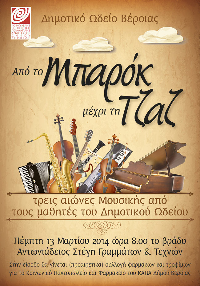 Είναι η πρώτη φορά που στην ίδια συναυλία εμφανίζονται σπουδαστές τόσο μεγάλου εύρους οργάνων (πιάνο, βιολί, βιολοντσέλο, κιθάρα, κλαρινέτο, φλάουτο, τρομπέτα, αρμόνιο, ακορντεόν, σαξόφωνο). Για το λόγο αυτό η παρακολούθησή της είναι πολύ χρήσιμη για όσους γονείς έχουν μικρά παιδιά και σκέφτονται πως θα ήθελαν να διδαχτούν αυτά κάποιο όργανο στο Ωδείο, αλλά και για τους μαθητές της έκτης τάξης του Δημοτικού που σκέφτονται να φοιτήσουν στο Μουσικό Σχολείο τη σχολική χρονιά 2014 - 15. Η είσοδος στην εκδήλωση που θα πραγματοποιηθεί στην Αντωνιάδειο Στέγη Γραμμάτων και Τεχνών την Πέμπτη 13 Μαρτίου και ώρα 8.00 μμ είναι ελεύθερη, αλλά προαιρετικά μπορούν οι θεατές να προσέρχονται με κάποιο τρόφιμο μακράς διάρκειας ή κάποιο φάρμακο για το κοινωνικό παντοπωλείο και το κοινωνικό φαρμακείο του Δήμου Βέροιας.