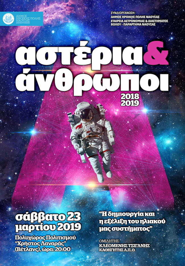 Συνεχίζεται η επιτυχημένη σειρά των ομιλιών «Αστέρια και Άνθρωποι στη νέα χιλιετία» που διοργανώνουν ο Δήμος Ηρωικής Πόλης Νάουσας και η Εταιρεία Αστρονομίας και Διαστήματος Βόλου - παράρτημα Νάουσας.