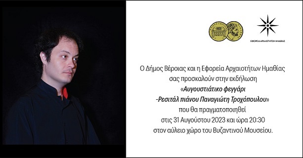 Μία μοναδική βραδιά υπό το φως του Αυγουστιάτικου φεγγαριού και υπό τους ήχους του πιάνου, θα χαρίσει ο Βεροιώτης πιανίστας, ΠαναγιώτηςΤροχόπουλος, στο μουσικόφιλο κοινό της πόλης, την Πέμπτη 31 Αυγούστου και ώρα 20:30, στον αύλειο χώρο του Βυζαντινού Μουσείου.