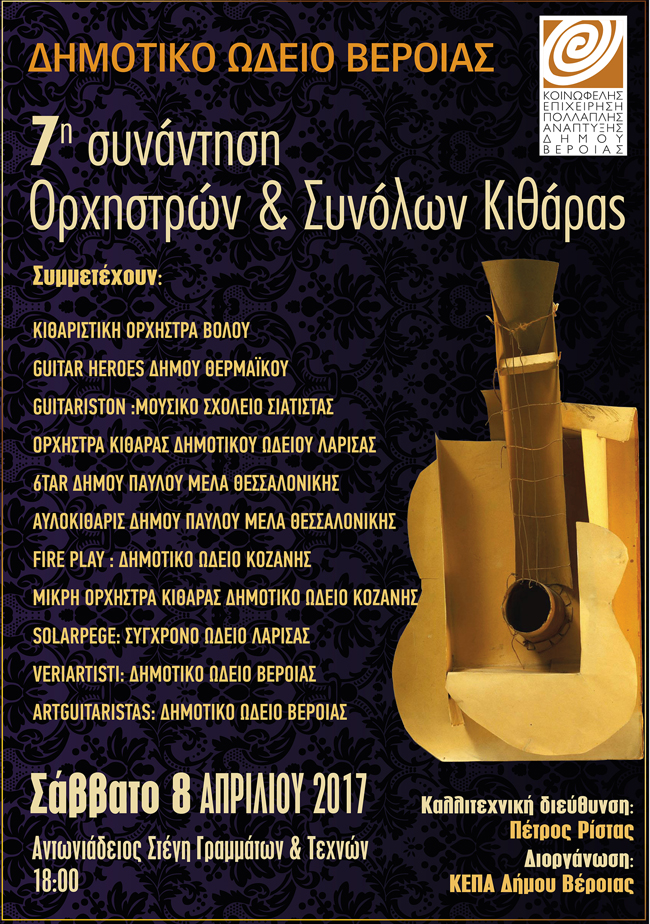H Κ.Ε.Π.Α. Δήμου Βέροιας σας προσκαλεί στην 7η ΣΥΝΑΝΤΗΣΗ ΟΡΧΗΣΤΡΩΝ ΚΑΙ ΣΥΝΟΛΩΝ ΚΙΘΑΡΑΣ, που θα πραγματοποιηθεί το Σάββατο 8/4 και ώρα 18.00 στην Αντωνιάδειο Στέγη Γραμμάτων και Τεχνών.