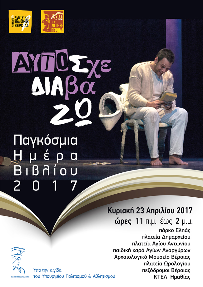 Ενόψει του εορτασμού της Παγκόσμιας Ημέρας Βιβλίου 2017, που διοργανώνουν η Ένωση Ελληνικού Βιβλίου (ΕΝΕΛΒΙ), η Εταιρεία Συγγραφέων και το Ελληνικό Τμήμα της ΙΒΒΥ, υπό την αιγίδα του Υπουργείου Πολιτισμού & Αθλητισμού, το ΔΗ.ΠΕ.ΘΕ Βέροιας και η Δημόσια Κεντρική Βιβλιοθήκη Βέροιας συμμετέχουν και γιορτάζουν στην πόλη της Βέροιας με το σύνθημα «Αυτοσχεδιάζω –Διαβάζω- Ζω»