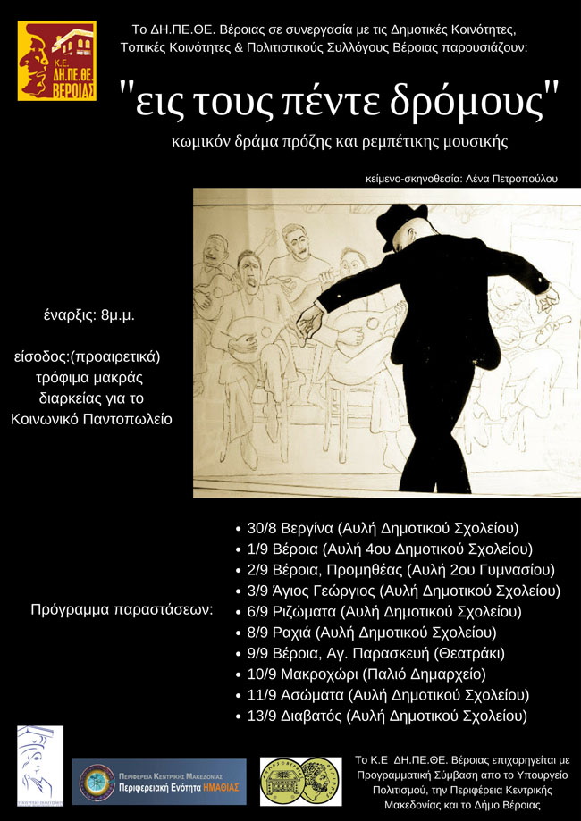 Το ΔΗ.ΠΕ.ΘΕ Βέροιας για το Καλοκαίρι 2017 κάνει περιοδεία, στις γειτονιές της Βέροιας και σε τοπικές κοινότητες του Δήμου με την παράσταση «Εις τους πέντε δρόμους» της Λένας Πετροπούλου. Οι παραστάσεις πραγματοποιούνται με τη συνεργασία των Δημοτικών Κοινοτήτων Βέροιας και Μακροχωρίου, των Τοπικών κοινοτήτων Βεργίνας, Δοβρά, Μακεδονίδος, Αποστόλου Παύλου, Ασωμάτων, Ράχης, και των Πολιτιστικών Συλλόγων «Αγίου Γεωργίου», «Διαβατού», «Καλλιθέας», «Προμηθέα», «Ασωμάτων», «Λαογραφικό Σύλλογο Ντόπιων Μακροχωρίου & Περιχώρων» και το «Σύλλογο Ποντίων Μακροχωρίου». Αρωγοί στην προσπάθεια αυτή είναι οι: Τεχνική Υπηρεσία, Αντιδημαρχία Καθαριότητας, Σχολική Επιτροπή Α/θμιας Εκπαίδευσης, Σχολική Επιτροπή Β/θμιας Εκπαίδευσης και η ΚΑΠΑ Δήμου Βέροιας.