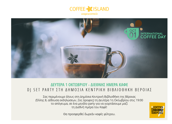 Διεθνής Ημέρα καφέ η 1η Οκτωβρίου και η Δημόσια Κεντρική Βιβλιοθήκη της Βέροιας σας προσκαλεί όλους σε ένα μουσικό party με δωρεάν καφέ φίλτρου, μία ευγενική προσφορά της Coffee Island.
