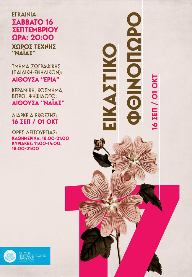 Ο Δήμος Ηρωικής Πόλης Νάουσας και ο Σύλλογος για τη Διάδοση των Εικαστικών Τεχνών Νάουσας διοργανώνουν την καθιερωμένη ετήσια έκθεση «Εικαστικό Φθινόπωρο 2017» από τα Εικαστικά Εργαστήρια του Δήμου Νάουσας, της οποίας τα εγκαίνια θα γίνουν την Σάββατο 16 Σεπτεμβρίου 2017 και ώρα 20:00 στον Χώρο Τέχνης «Ναϊάς».