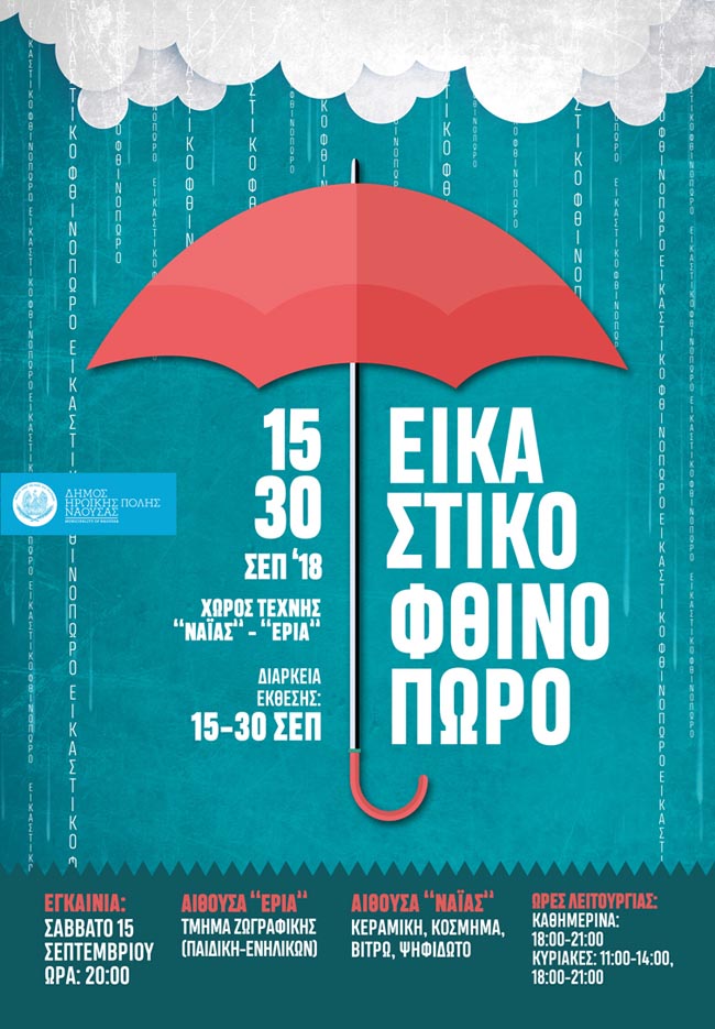 Ο Δήμος Ηρωικής Πόλης Νάουσας και ο Σύλλογος για τη Διάδοση των Εικαστικών Τεχνών Νάουσας διοργανώνουν την καθιερωμένη ετήσια έκθεση «Εικαστικό Φθινόπωρο 2018» από τα Εικαστικά Εργαστήρια του Δήμου Νάουσας, της οποίας τα εγκαίνια θα γίνουν την Σάββατο 15 Σεπτεμβρίου 2018 και ώρα 20:00 στον Χώρο Τέχνης «Ναϊάς».