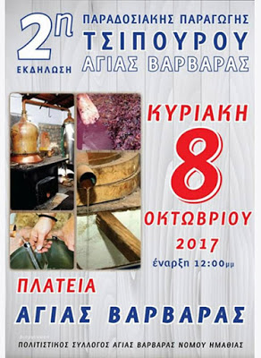 Ο Πολιτιστικός Σύλλογος Αγίας Βαρβάρας διοργανώνει και σας προσκαλεί στην 2η Εκδήλωση Παραδοσιακής Παραγωγής Τσίπουρο Αγίας Βαρβάρας την Κυριακή 8 Οκτωβρίου 2017 και ώρα έναρξης 12:00 μ.μ. στην πλατεία της Αγίας Βαρβάρας Νομού Ημαθίας..