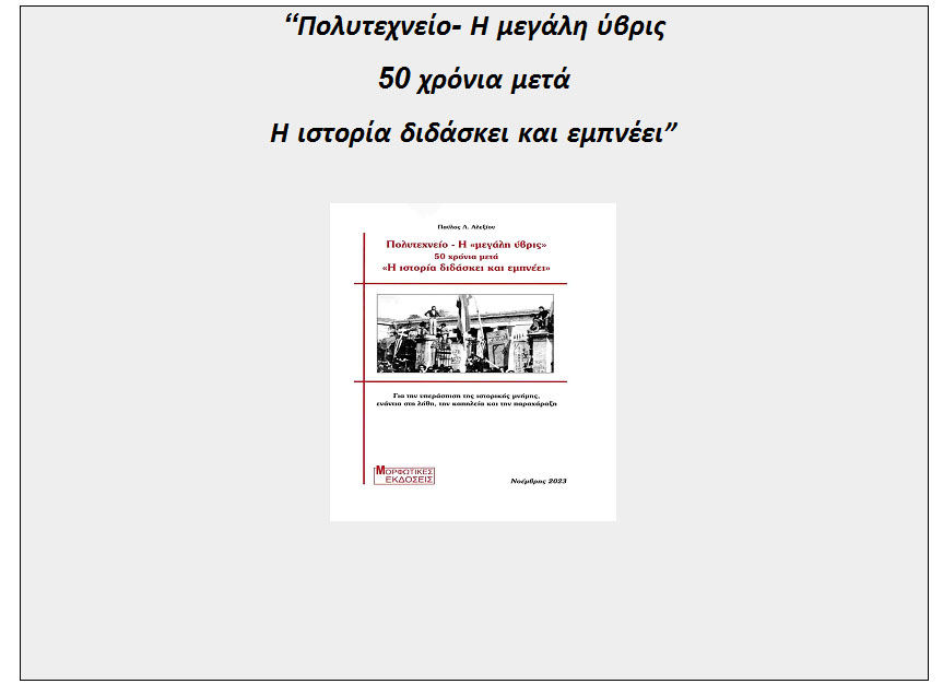Η Κ.Ο. Ημαθίας του Μ-Λ ΚΚΕ και οι ΜΟΡΦΩΤΙΚΕΣ ΕΚΔΟΣΕΙΣ, τιμώντας τα 50 χρόνια από την εξέγερση του Πολυτεχνείου, πραγματοποιούν εκδήλωση παρουσίαση του βιβλίου του Παύλου Αλεξίου.