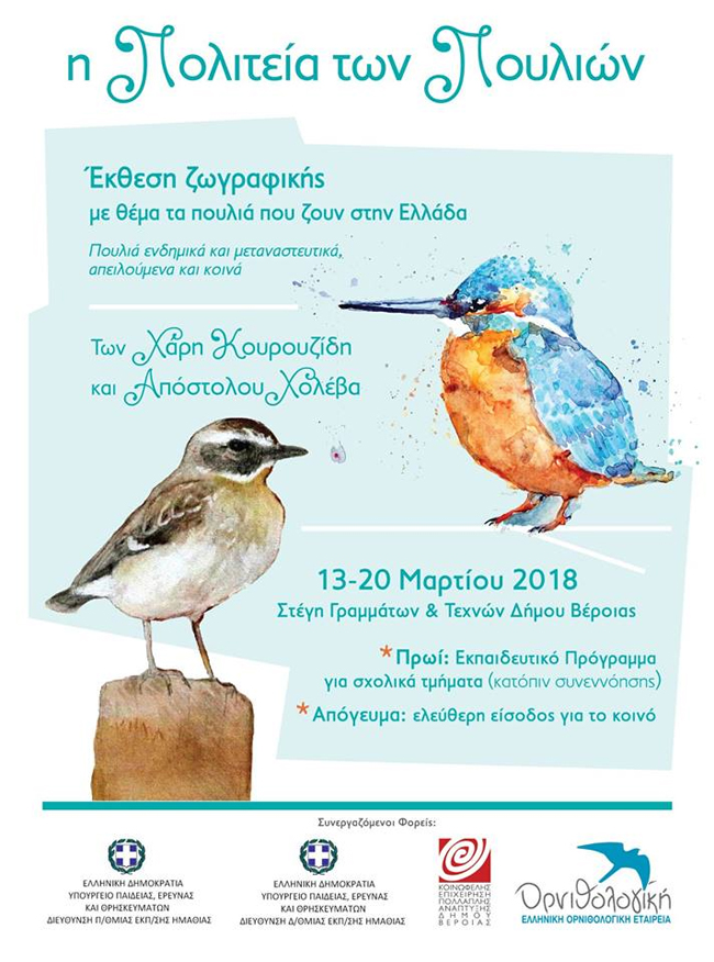 Οι Διευθύνσεις Πρωτοβάθμιας και Δευτεροβάθμιας Εκπαίδευσης Ημαθίας, η Ελληνική Ορνιθολογική Εταιρεία και η ΚΕΠΑ Δήμου Βέροιας, φιλοξενούν την έκθεση ζωγραφικής των Απόστολου Χολέβα και Χάρη Κουρουζίδη, με τίτλο: «Η πολιτεία των πουλιών».