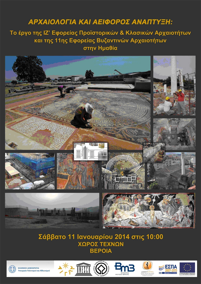 Η ΙΖ’ Εφορεία Προϊστορικών και Κλασικών Αρχαιοτήτων και η 11η Εφορεία Βυζαντινών Αρχαιοτήτων υποδέχονται το νέο χρόνο με έναν απολογισμό του έργου τους στο Νομό Ημαθίας, και θέτουν ακόμη πιο φιλόδοξους στόχους για την προστασία και την ανάδειξη των πολύ σημαντικών μνημείων και αρχαιολογικών χώρων της περιοχής, αλλά και τη δημιουργία νέων μουσειακών εκθέσεων και πολυποίκιλων ερευνητικών και εκπαιδευτικών δραστηριοτήτων ώστε, εν όψει και της νέας προγραμματικής περιόδου ΣΕΣ 2014-2020, να συμβάλουν ουσιαστικά στην ανάπτυξη της περιοχής.