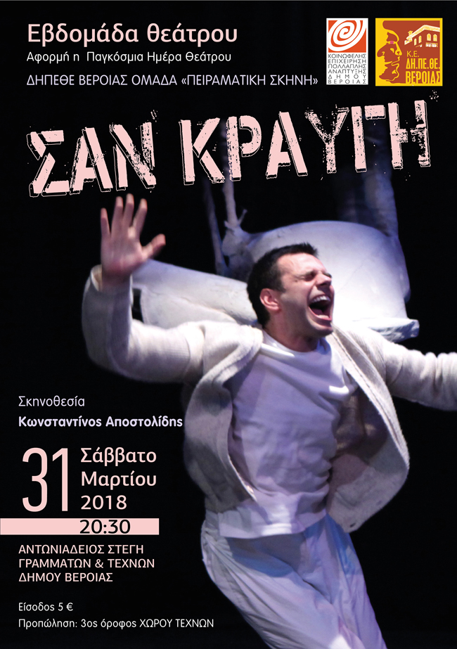 H ομάδα «Πειραματική Σκηνή» του Τμήματος Θεατρικής Υποδομής του ΔΗ.ΠΕ.ΘΕ. Βέροιας παρουσιάζει την παράσταση «Σαν Κραυγή» στο πλαίσιο της «Εβδομάδας Θεάτρου 2018». Η παράσταση θα δοθεί το Σάββατο 31 Μαρτίου 2018, ώρα 8.30μ.μ. στην Αντωνιάδειο Στέγη Γραμμάτων & Τεχνών με γενική είσοδο 5€.