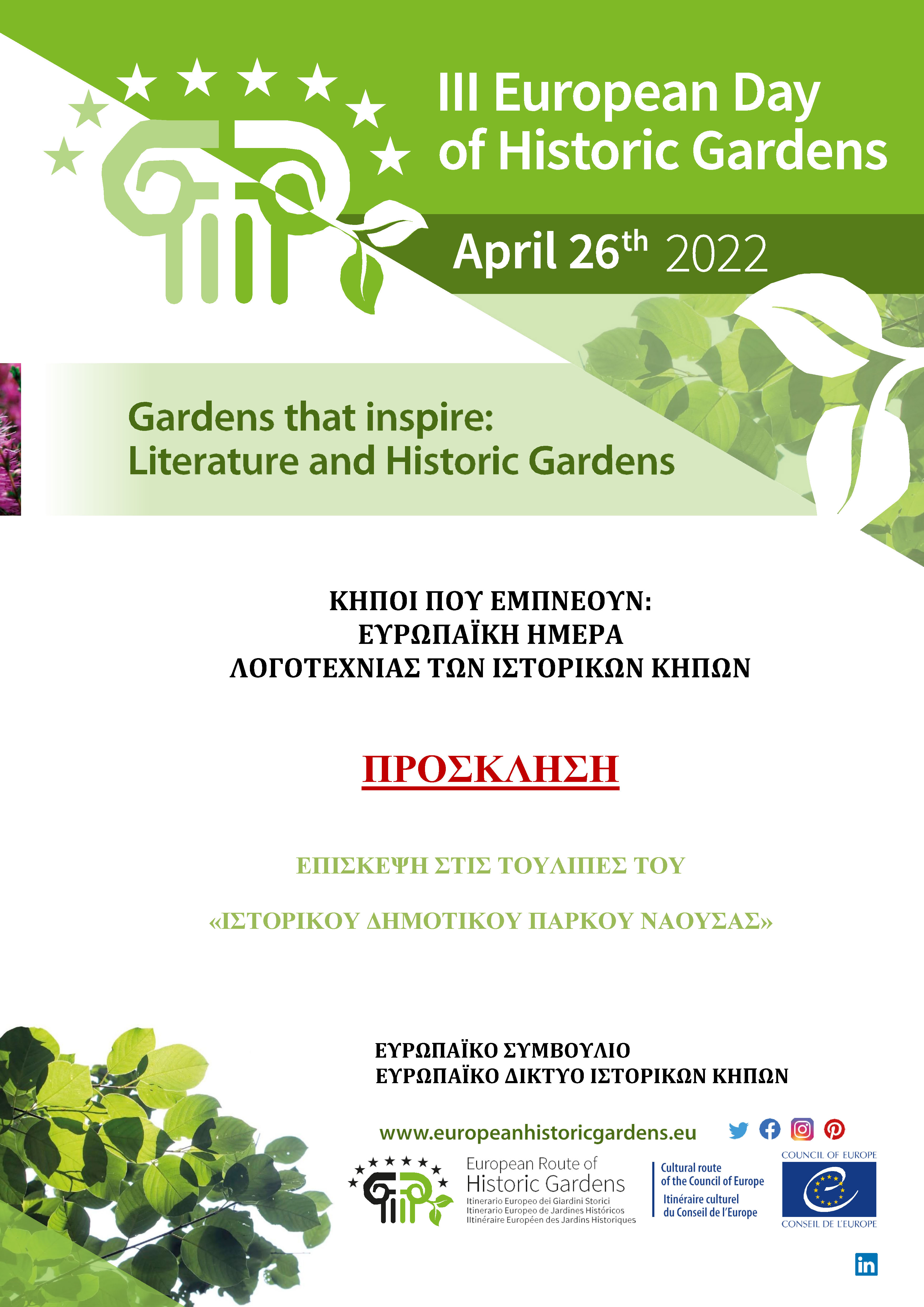 Λογοτεχνίας των Ιστορικών Κήπων (Τρίτη 26 Απριλίου), καλεί τους δημότες και