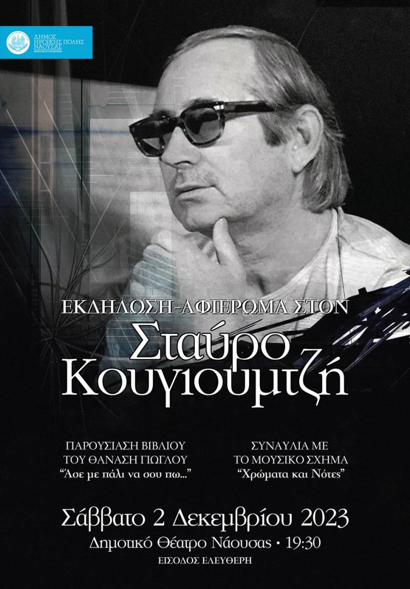 Ο Δήμος Η.Π. Νάουσας ανακοινώνει ότι η είσοδος στην εκδήλωση - αφιέρωμα στον συνθέτη Σταύρο Κουγιουμτζή το Σάββατο 2 Δεκεμβρίου στο Δημοτικό Θέατρο "Μίκης Θεοδωράκης" είναι ελεύθερη για το κοινό με κάρτες ελεύθερης εισόδου, οι οποίες θα είναι διαθέσιμες από την προσεχή Δευτέρα 27/11 στα εξής σημεία: