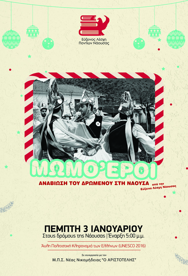 Το πανάρχαιο έθιμο των Μωμόγερων θα αναβιώσει η Εύξεινος Λέσχη Ποντίων Νάουσας – Εθνική Βιβλιοθήκη Αργυρουπόλεως «Ο Κυριακίδης» την Πέμπτη 3 Ιανουαρίου 2019. Με έναρξη στις 5:00 μ.μ., από το κτίριο του συλλόγου, οι 12 μωμόγεροι, η Νύφη, ο Διάβολον, ο Γέρον, η Γραία και οι υπόλοιποι θα ξεχυθούν στους κεντρικούς δρόμους της πόλης της Νάουσας και θα την κάνουν να χορέψει στους ρυθμούς τους.