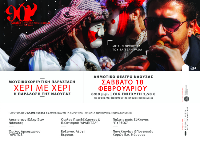 Η Εύξεινος Λέσχη Ποντίων Νάουσας διοργανώνει μουσικοχορευτική παράσταση αφιερωμένη στα 90 χρόνια ζωής του συλλόγου και στην Παράδοση της Νάουσας, με τίτλο «Χέρι με Χέρι». Η εκδήλωση θα πραγματοποιηθεί το Σάββατο 18 Φεβρουαρίου και ώρα 8:00 μ.μ. στο Δημοτικό Θέατρο Νάουσας.