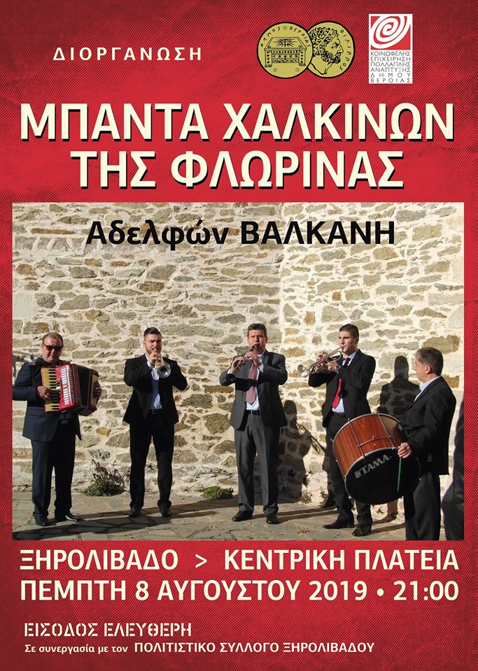 Ο Δήμος Βέροιας και η Κ.Ε.Π.Α. , διοργανώνουν συναυλία με ελεύθερη είσοδο και φιλοξενούν ένα από τα σπουδαιότερα παραδοσιακά σχήματα της Ελλάδας , τα Χάλκινα τους Φλώρινας με το συγκρότημα των αδελφών Βαλκάνη. Η συναυλία θα πραγματοποιηθεί στην πλατεία του Ξηρολιβάδου, το Σάββατο 13 Ιουλίου , με ελεύθερη είσοδο και με την υποστήριξη του Πολιτιστικού Συλλόγου Ξηρολιβάδου.