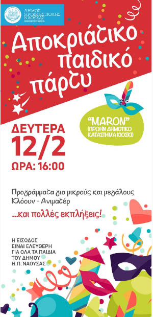 Ο Δήμος Ηρωικής Πόλης Νάουσας διοργανώνει παιδικό μασκέ πάρτι την Δευτέρα 12 Φεβρουαρίου 2018 και ώρα 16:00 το απόγευμα στο “MARON” (πρώην δημοτικό κατάστημα «ΚΙΟΣΚΙ»).