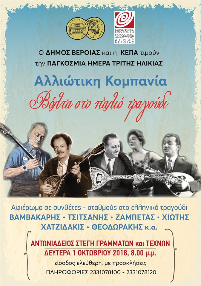 Ο Δήμος Βέροιας και η ΚΕΠΑ τιμούν την ΠΑΓΚΟΣΜΙΑ ΗΜΕΡΑ ΓΙΑ ΤΗΝ ΤΡΙΤΗ ΗΛΙΚΙΑ (γιορτάζεται 1Η Οκτώβρη κάθε έτους) με μια συναυλία – αφιέρωμα στο παλιό τραγούδι μέσα από συνθέτες – σταθμούς , εκ των σπουδαιότερων που γνώρισε η ελληνική μουσική σκηνή . Από τον Βαμβακάρη και τον Τσιτσάνη ως το Χατζιδάκι και τον Θεοδωράκη , από το ρεμπέτικο ως το αυθεντικό λαϊκό τραγούδι , θα παρουσιαστούν σημαντικά έργα της ελληνικής μουσικής σκηνής του τελευταίου αιώνα , τραγούδια γνωστά και αγαπημένα! Η «Αλλιώτικκη Κομπανία» , το εξαμελές αθηναϊκό σχήμα του Αχιλλέα Γκουγκουστάμου μας υπόσχεται μια αξέχαστη «βόλτα στο παλιό τραγούδι»!