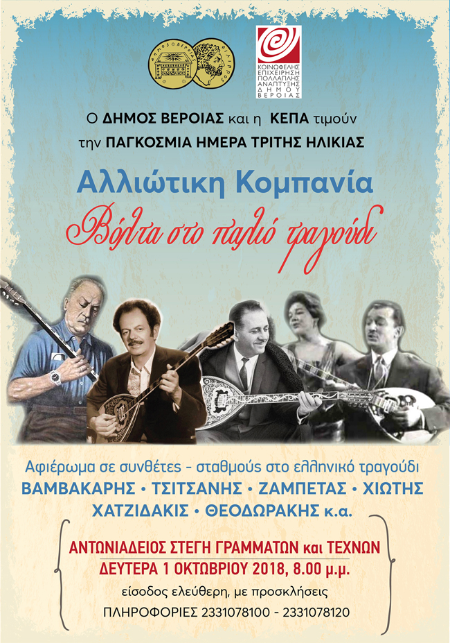 Ο Δήμος Βέροιας και η ΚΕΠΑ τιμούν την ΠΑΓΚΟΣΜΙΑ ΗΜΕΡΑ ΓΙΑ ΤΗΝ ΤΡΙΤΗ ΗΛΙΚΙΑ (γιορτάζεται 1Η Οκτώβρη κάθε έτους) με μια συναυλία – αφιέρωμα στο παλιό τραγούδι μέσα από συνθέτες – σταθμούς , εκ των σπουδαιότερων που γνώρισε η ελληνική μουσική σκηνή . Από τον Βαμβακάρη και τον Τσιτσάνη ως το Χατζιδάκι και τον Θεοδωράκη , από το ρεμπέτικο ως το αυθεντικό λαϊκό τραγούδι , θα παρουσιαστούν σημαντικά έργα της ελληνικής μουσικής σκηνής του τελευταίου αιώνα , τραγούδια γνωστά και αγαπημένα! Η «Αλλιώτικκη Κομπανία» , το εξαμελές αθηναϊκό σχήμα του Αχιλλέα Γκουγκουστάμου μας υπόσχεται μια αξέχαστη «βόλτα στο παλιό τραγούδι»!