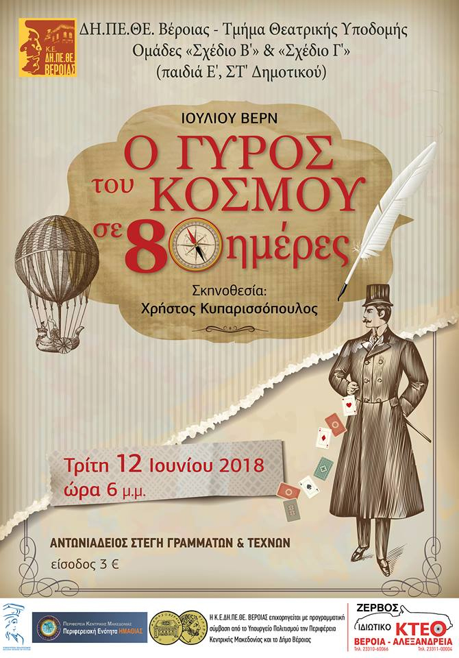 Οι Ομάδες «Σχέδιο Β’» και «Σχέδιο Γ’» του Τμήματος Θεατρικής Υποδομής του ΔΗ.ΠΕ.ΘΕ. Βέροιας παρουσιάζουν την παράσταση «Ο Γύρος του κόσμου σε 80 μέρες» του Ιούλιου Βέρν, σε σκηνοθεσία του Χρήστου Κυπαρισσόπουλου. Η παράσταση θα δοθεί την Τρίτη 12 Ιουνίου 2018 στις 6.00μ.μ. στην Αντωνιάδεια Στέγη Γραμμάτων & Τεχνών στη Βέροια, με γενική είσοδο 3€.