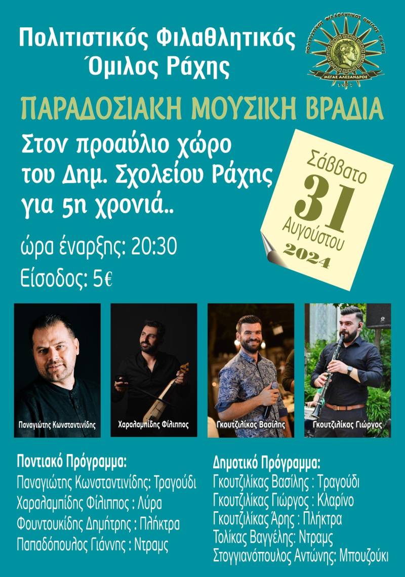 Ο Πολιτιστικός Φιλαθλητικός Όμιλος Ράχης διοργανώνει για πέμπτη συνεχόμενη χρονιά την Παραδοσιακή Μουσική Βραδιά, μια εκδήλωση που έχει γίνει πλέον θεσμός για την περιοχή. Το Σάββατο, 31 Αυγούστου, στις 20:30 μ.μ., στο προαύλιο χώρο του Δημοτικού Σχολείου Ράχης, θα πραγματοποιηθεί η εκδήλωση, η οποία υπόσχεται ένα όμορφο κλείσιμο του καλοκαιριού.