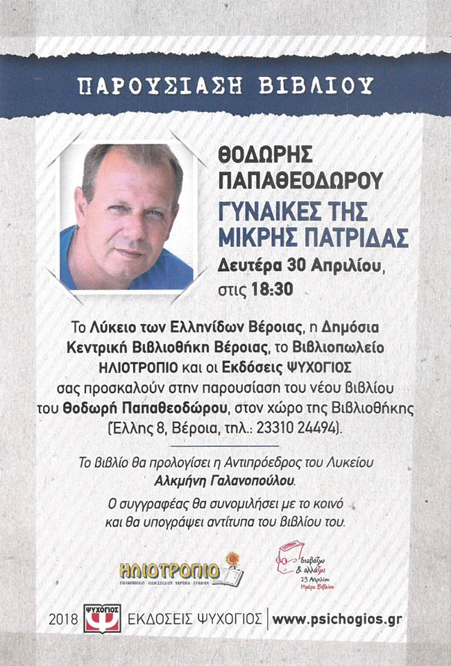 Το Λύκειο των Ελληνίδων Βέροιας , η Δημόσια Κεντρική Βιβλιοθήκη Βέροιας το Βιβλιοπωλείο ΗΛΙΟΤΡΟΠΙΟ και οι Εκδόσεις ΨΥΧΟΓΙΟΣ σας προσκαλούν στην παρουσίαση του νέου βιβλίου του Θοδωρή Παπαθεοδώρου «ΓΥΝΑΙΚΕΣ ΤΗΣ ΜΙΚΡΗΣ ΠΑΤΡΙΔΑΣ» την Δευτέρα 30 Απριλίου στις 18:30 στον χώρο της βιβλιοθήκης ( Έλλης 8)