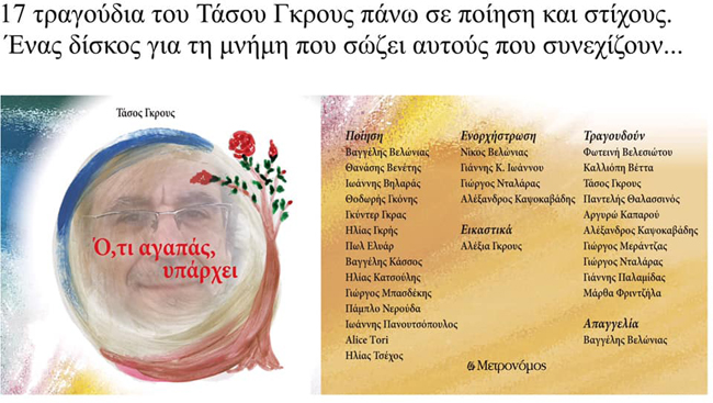Ενώ ο Τάσος Γκρους συνομιλώντας με το παλικάρι του, μας δένει: ''Πέρασε ακριβώς ένας ολόκληρος χρόνος, από τότε που είπες 'φεύγω'. Ένα φευγιό αβάσταχτο και άδικο. Όμως το ξέρεις, ότι δεν έχει περάσει ούτε μια στιγμή χωρίς να είσαι εδώ. Μέσα στην καρδιά και την ψυχή μας.Το ξέρω. Θέλεις να εκφράσω την βαθιά ευγνωμοσύνη μας σε όλους τους ανθρώπους του νοσοκομείου Άγιος Σάββας, καθώς και στους γιατρούς στην Ιταλία, που έδωσαν την άνιση μάχη να σε κρατήσουν μαζί μας.Το έχω κάνει ήδη.Το ξέρω. θέλεις να εκφράσω και ένα μεγάλο ευχαριστώ στους ποιητές, στους στιχουργούς, σε όλους τους ενορχηστρωτές, τραγουδιστές, μουσικούς, ηχολήπτες, τεχνικούς, που εργάστηκαν με μεράκι και αγάπη γι’ αυτά τα τραγούδια που είναι αφιερωμένα στη μνήμη σου. Το έκανα κι αυτό. Μόλις τώρα. Εσύ μόνο να ξέρεις ότι εμείς, θα παίρνουμε στα χέρια μας την κιθάρα σου και θα ’ναι σαν να σ΄αγκαλιάζουμε. Έτσι, θα είσαι πάντα εδώ. Δεν θα λείπεις ούτε στιγμή. Το ακούς; Ούτε στιγμή...''
