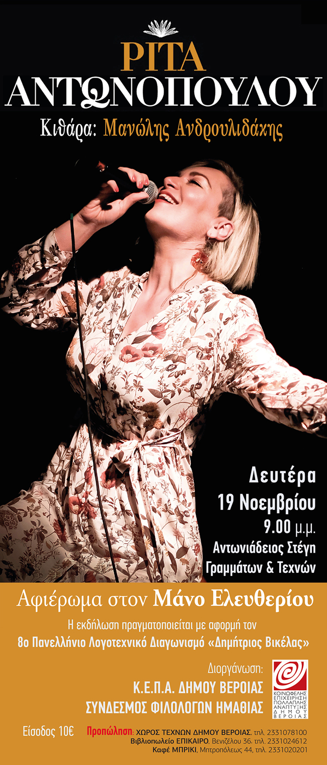 Η Ρίτα Αντωνοπούλου, στη σημαντικότερη στιγμή της πορείας της, συναντά τον σπουδαίο κιθαριστή Μανόλη Ανδρουλιδάκη και μαζί παρουσιάζουν ένα μοναδικό αφιέρωμα στον ποιητή & στιχουργό ΜΑΝΟ ΕΛΕΥΘΕΡΙΟΥ.