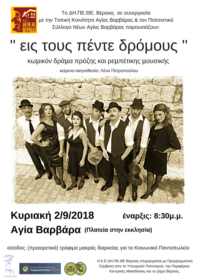 Μετά από τη μεγάλη επιτυχία της παραγωγής του ΔΗ.ΠΕ.ΘΕ Βέροιας «Εις τους πέντε δρόμους!» το Καλοκαίρι 2017, η παράσταση ξεκινά περιοδεία και το Καλοκαίρι 2018, στις γειτονιές της Βέροιας και σε Τοπικές Κοινότητες του Δήμου με την παράσταση «Εις τους πέντε δρόμους» της Λένας Πετροπούλου.