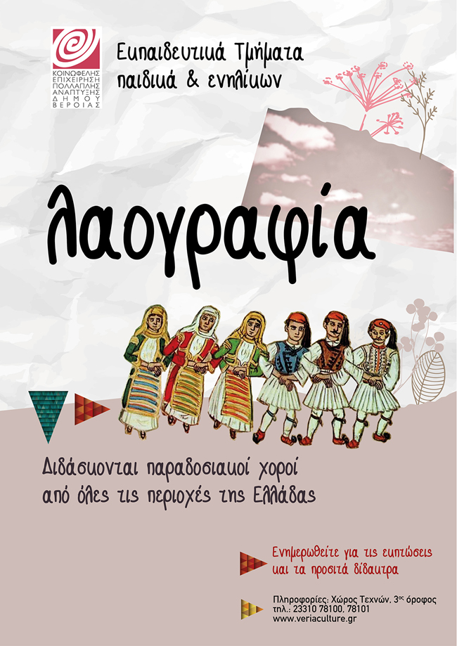 Το τμήμα Λαογραφίας της ΚΕΠΑ Δήμου Βέροιας, ιδρύθηκε το 1977 και είναι μέλος της CIOFF (Διεθνής Οργάνωση Λαϊκής Τέχνης και Παραδοσιακών Χορών).