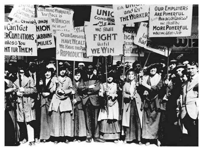 Οι συνθήκες εργασίας στα κέντρα του εμπορίου ενδυμάτων στις μεγάλες πόλεις, όπως η Νέα Υόρκη, ήταν μεσαιωνικές. Συχνά εκδηλώνονταν πυρκαγιές που έθεταν σε κίνδυνο τη ζωή των εργαζομένων, ο φωτισμός κάτω από τον οποίο δούλευαν ήταν ανεπαρκής, ο ήχος των μηχανημάτων εκκωφαντικός και το περιβάλλον ανθυγιεινό. Στις εργάτριες επιβάλλονταν πρόστιμα επειδή μιλούσαν, γελούσαν ή τραγουδούσαν, για τους λεκέδες από τα λάδια των μηχανών πάνω στα υφάσματα, για τα γαζιά που ήταν πολύ σφιχτά ή πολύ χαλαρά.