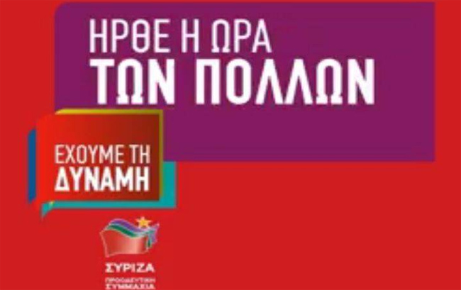 Ενα προκλητικό προεκλογικό σποτ, με τίτλο «Η δύναμη των Ελλήνων», αντιγραφή παλιότερων του ΠΑΣΟΚ, κυκλοφόρησε ο ΣΥΡΙΖΑ στα Μέσα Ενημέρωσης. Η νούμερο 1 πρόκληση είναι ότι προσπαθεί (για ακόμα μια φορά) να καπηλευθεί πρόσωπα και κορυφαίες στιγμές του εργατικού - λαϊκού και του κομμουνιστικού κινήματος στην Ελλάδα, πετώντας ανάμεσα στα εναλλασσόμενα πλάνα φωτογραφίες του Βάρναλη, του Ρίτσου, του Βελουχιώτη, του Ζαχαριάδη, του Μπελογιάννη, του Πλουμπίδη, της Μάχης της Αθήνας, του ΔΣΕ, του Γρηγόρη Λαμπράκη, της αντιδικτατορικής πάλης.